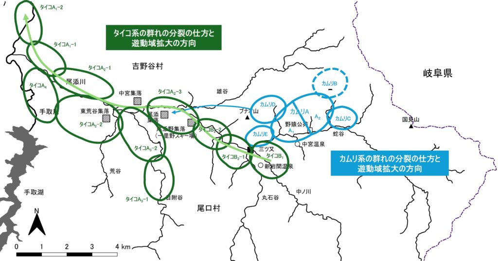 ここでもう一度、図3を見て欲しい。「カムリA群」の分裂群はのちに高飛びする1群を除き蛇谷流域にとどまって、中ノ川流域や三ツ又より下流までは遊動域を拡大していない。一方「タイコの群れ」は中ノ川から尾添川下流まで遊動域をどんどん広げ、さらに手取川本流まであっという間に到達した。